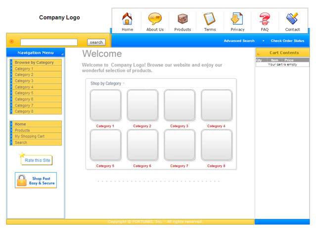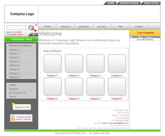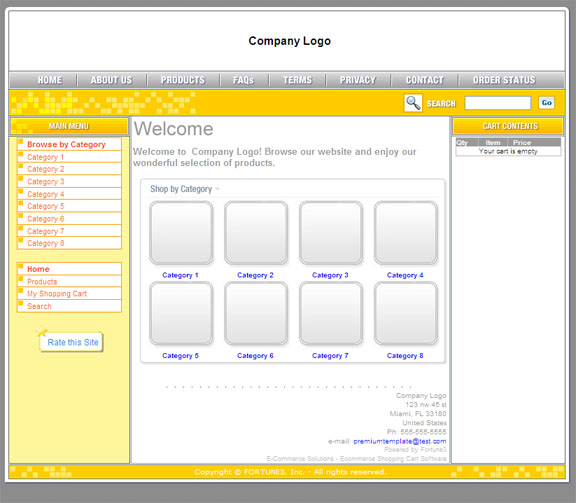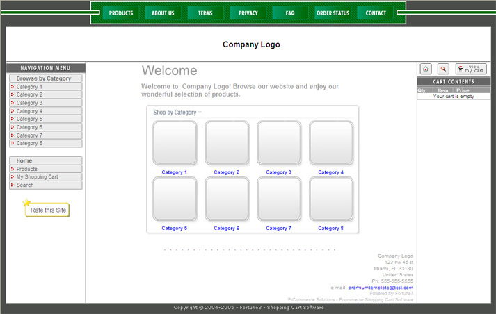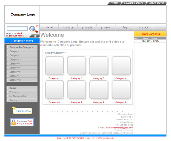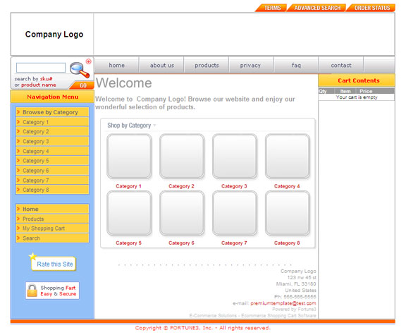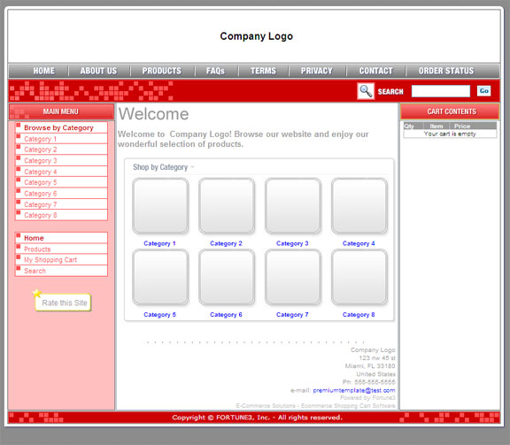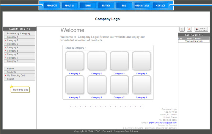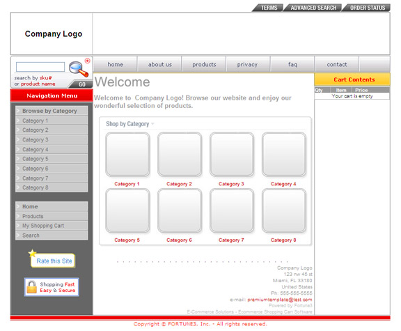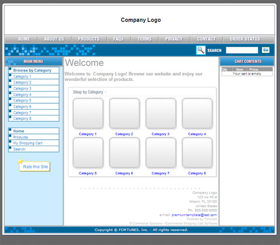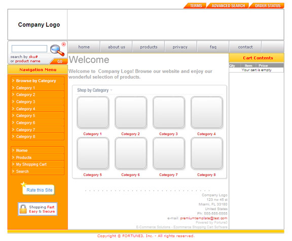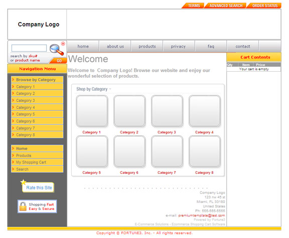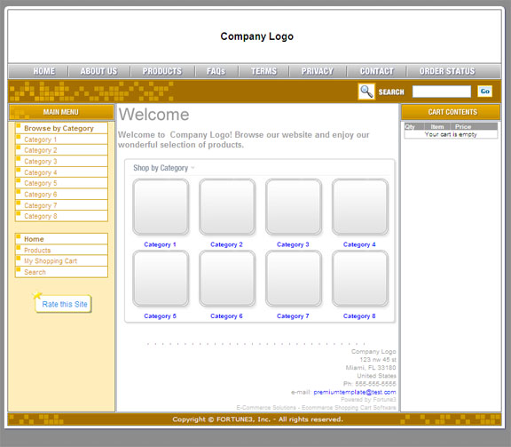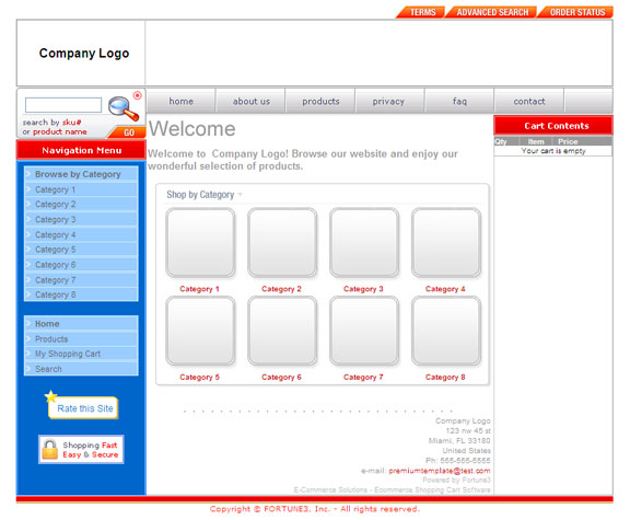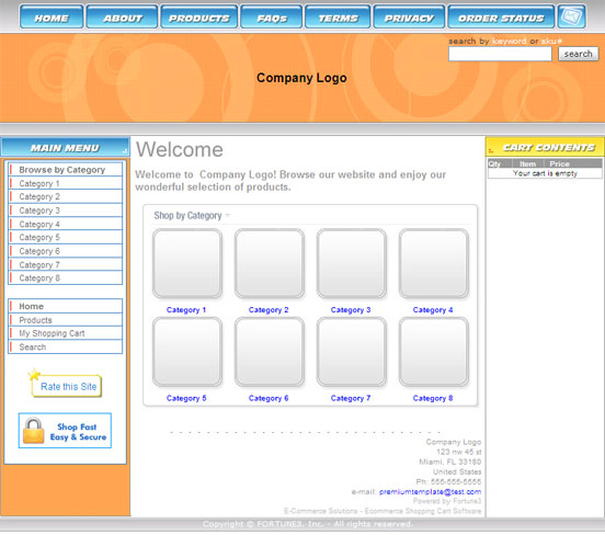 The Fortune3 Wizard and Shopping Cart Software comes with the following list of design templates for free. When you create and manage your online store with our shopping cart software, you will be able to select any of the templates listed below to use with your shopping cart website.
