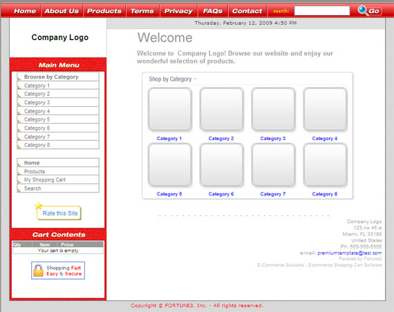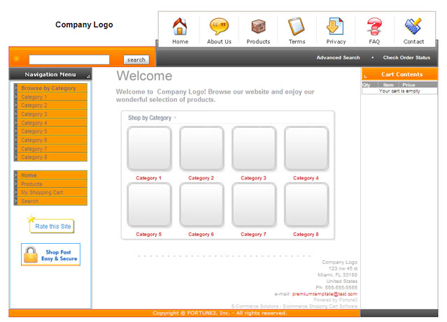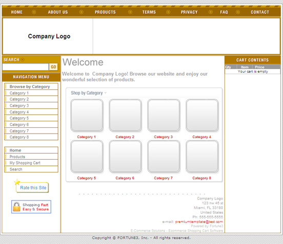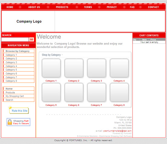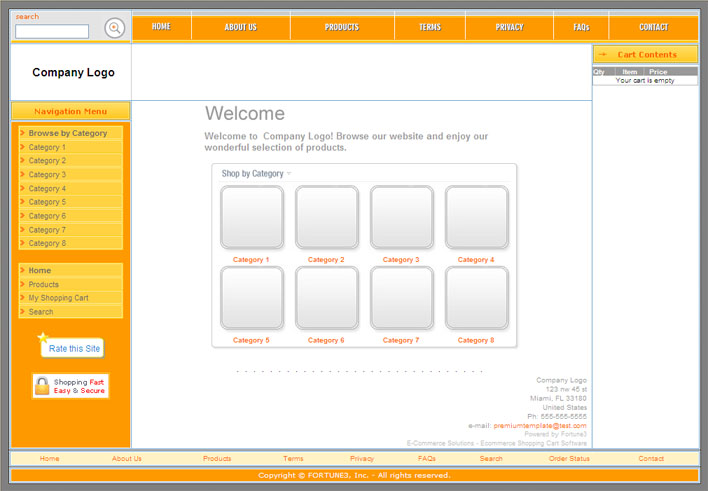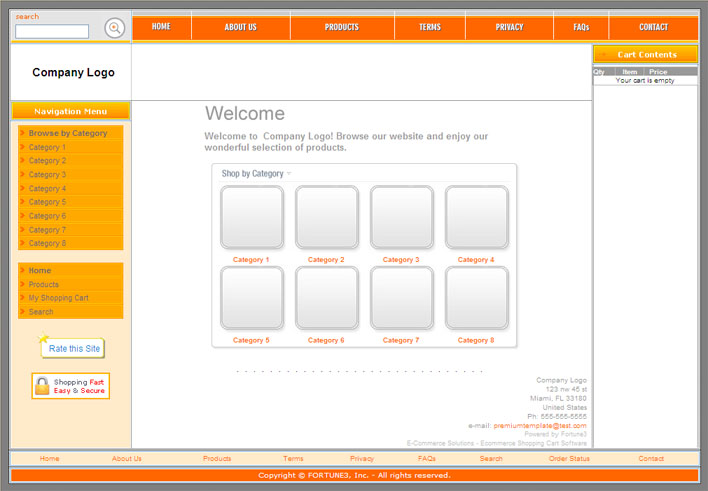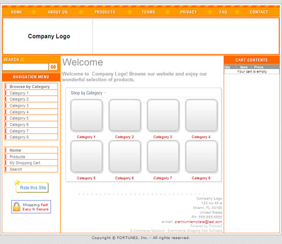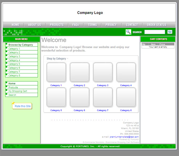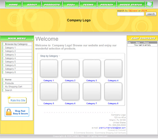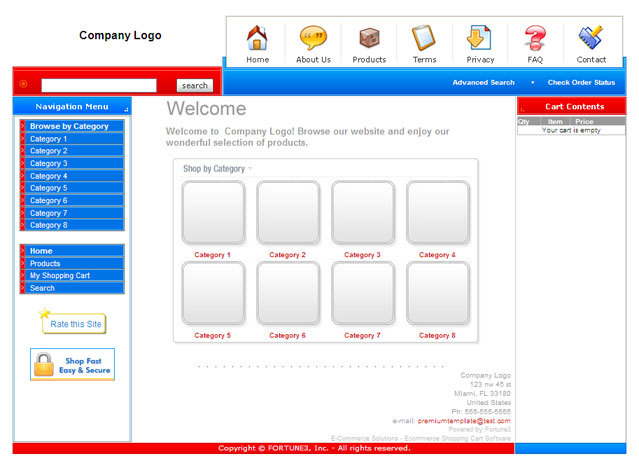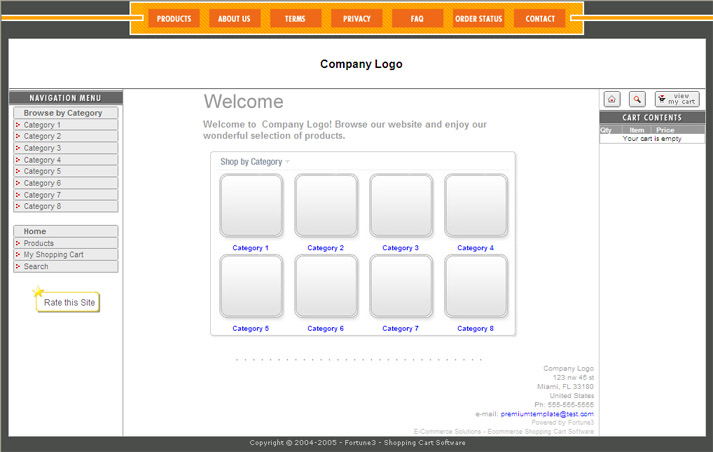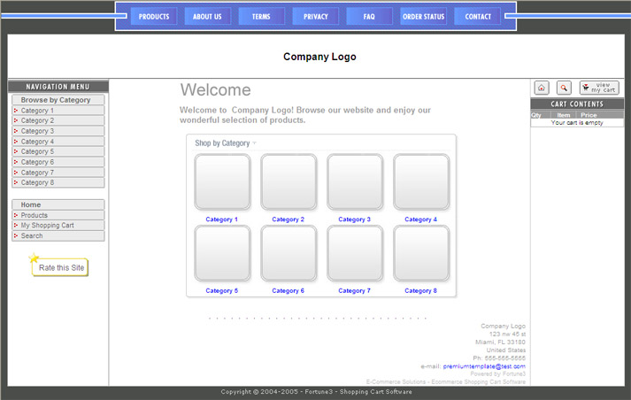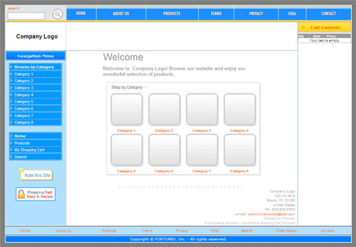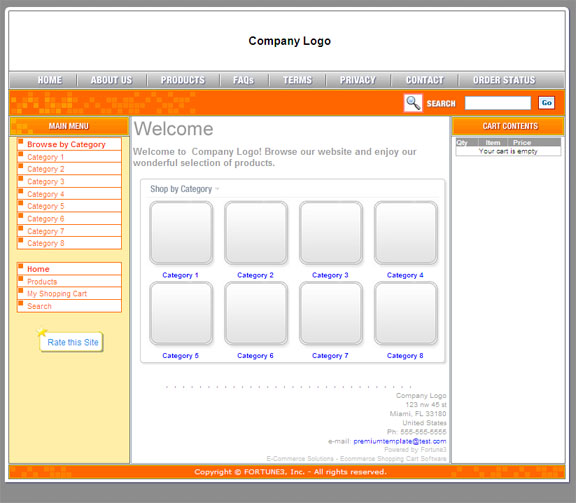 The Fortune3 Wizard and Shopping Cart Software comes with the following list of design templates for free. When you create and manage your online store with our shopping cart software, you will be able to select any of the templates listed below to use with your shopping cart website.