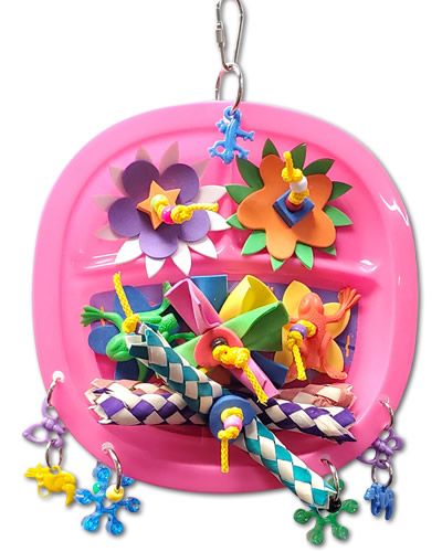 Bird toy creations toy plate is served up with foam flowers, foam beads, plastic charms and bamboo finger traps. Hours of enjoyment!