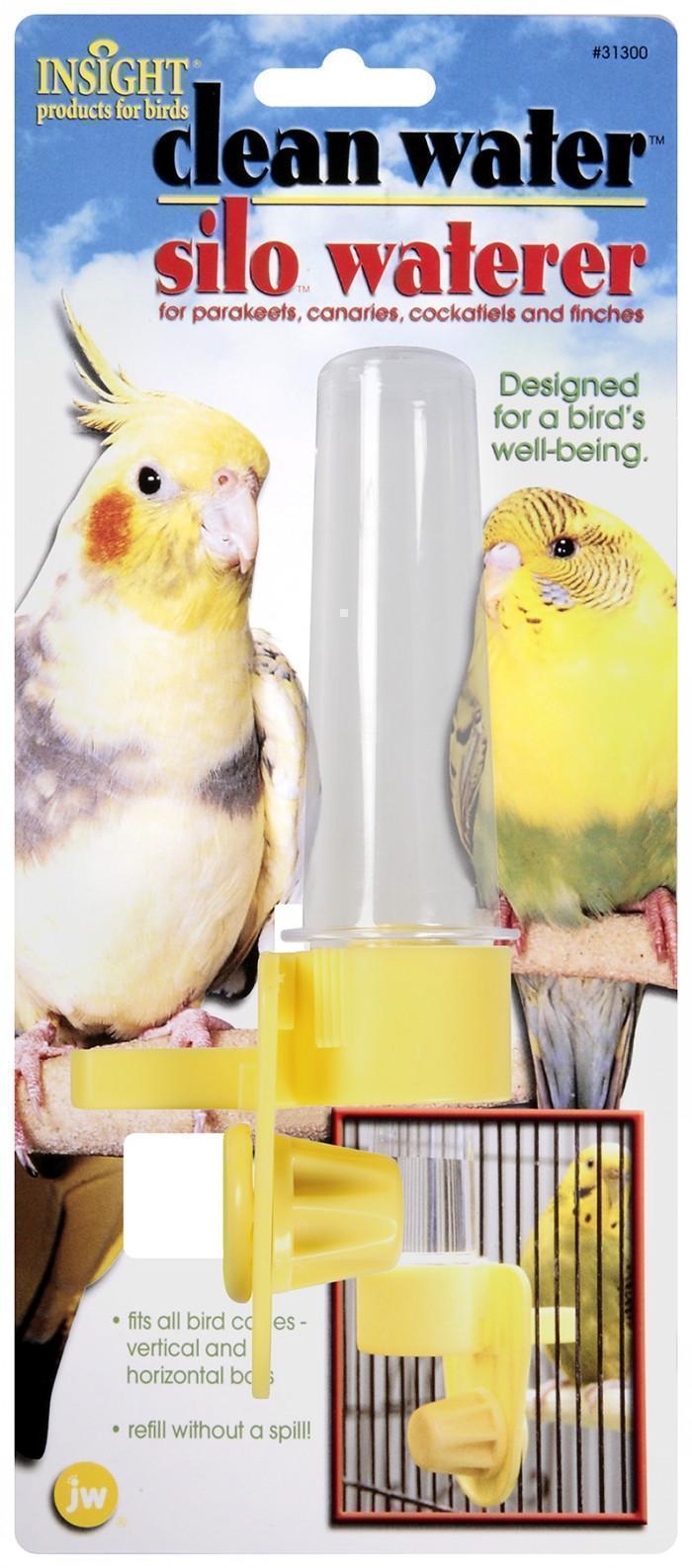 JW Pet Clean Water Silo Bird Waterer small is designed for a birds well-being and fits all bird cages. It refills without a spill and will offer clean water to your bird. It is easy to fill and holds double the water of a normal water bowl. Colors will vary.