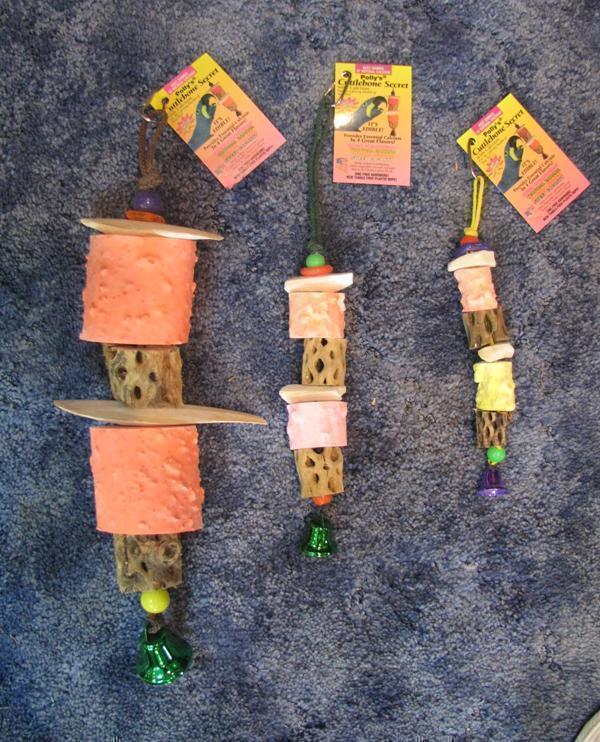 Polly's small cuttlebone secrets is a tasty and healthy calcium toy that contains cuttlebone, cholla wood and calcium chunks. The toy is great for chewing and the liberty bell at the bottom adds even more fun.