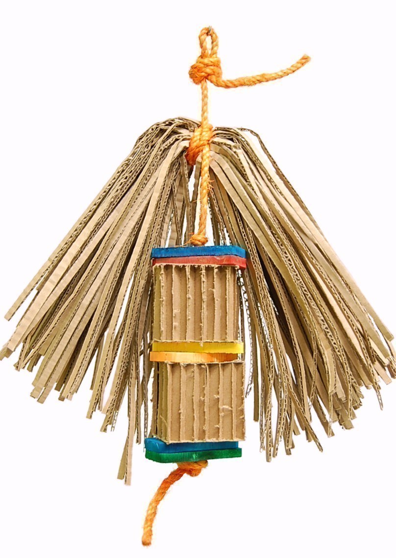 At the top of this toy is a bundle of thick paper shreds and hanging in the center are two accordion style paper boxes with pieces of wood in between them. This toy is great for shredding, preening and chewing and you can even slide some treats into the boxes and turn it into a foraging opportunity.