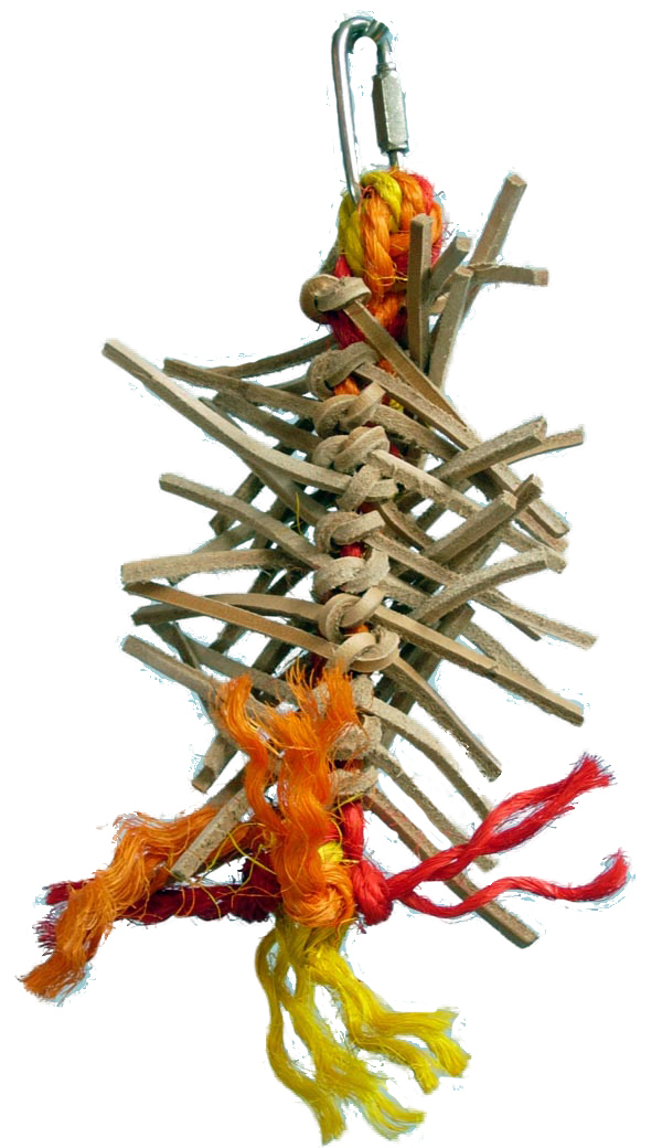 A great toy to satisfy chewing and preening pleasure! This toy has a ton of cut and knotted leather strips sticking out all over it threaded with colored sisal rope. This toy will keep your bird busy chewing and pulling for hours.