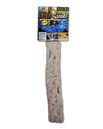 Pollys desert sands medium perch is made with textured desert sand, that make these perches just right for coarser nail trimming. The dimples protect your bird's foot pads, and with the sparkling glitter, they're attractive and stimulating. Lightweight and durable, they maintain a normal temperature for comfortable perching.