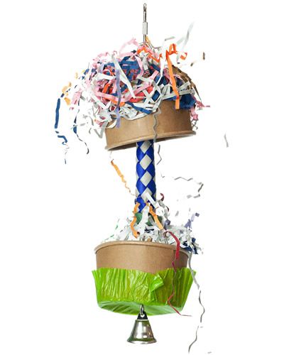 Happy beaks cupcake explosion has a finger trap between the cupcake with crinkle paper stuffed in the bottom cup. A great foraging toy that can be stuffed with treats.