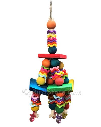 Happy Beaks Fiesta Blocks bird toy is chock full of wood and plastic parts for birds to beak. Little wavy plastic parts easily move around and baby pacifiers finish off the bottom of each strand. There are even wood slices for chewing.