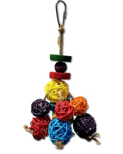 Happy Beaks have a ball bird toy has lots of colorful wicker balls strung on rope with brightly colored wood pieces throughout it to make this a toy a shredder's delight.