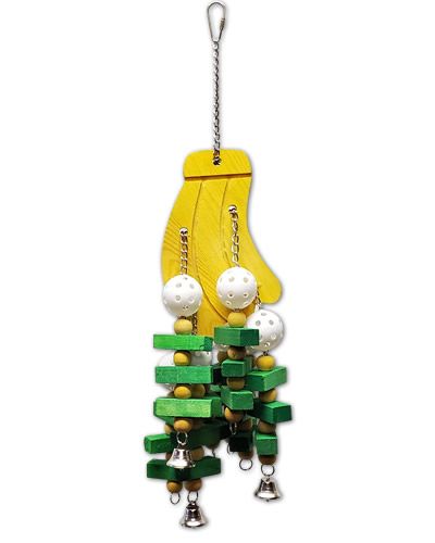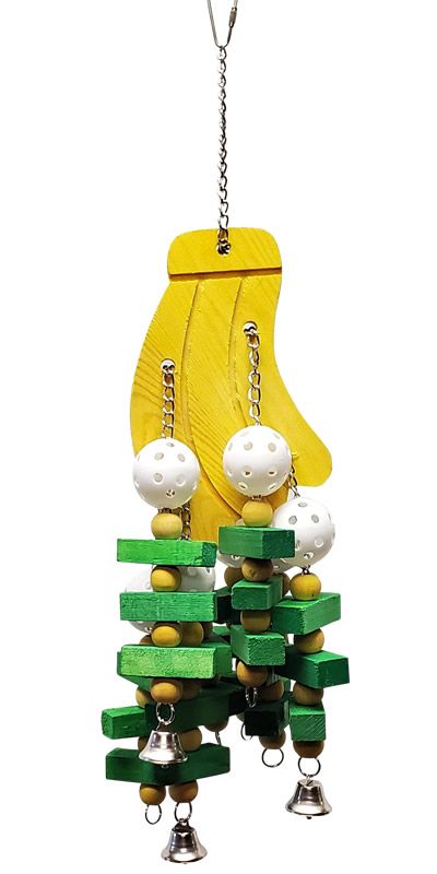 This brightly colored large banana bird toy is a big hit! Chewable wood blocks and balls make this toy great for chewing and the movement this toy makes will keep your bird intrigued.