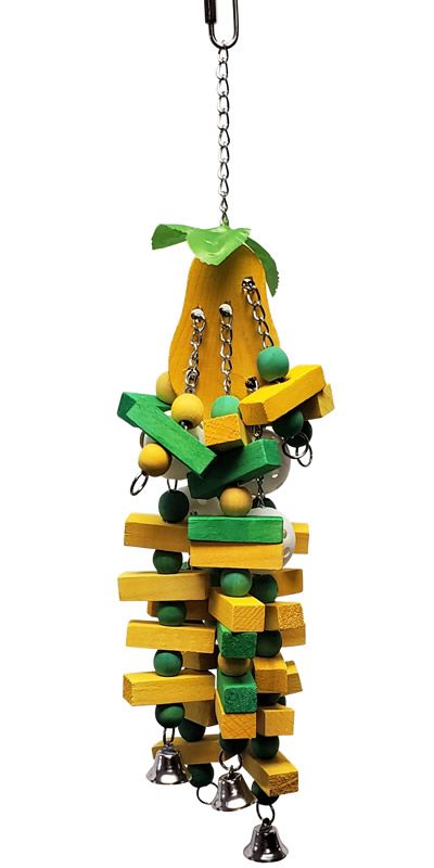 This brightly colored large pear bird toy is a big hit! Chewable wood blocks and balls make this toy great for chewing and the movement this toy makes will keep your bird intrigued.