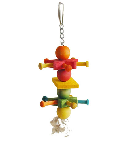 Happy beaks wooden cowboy spur bird toy has multicolored wood beads and blocks strung on chain with a rope knot at the bottom.