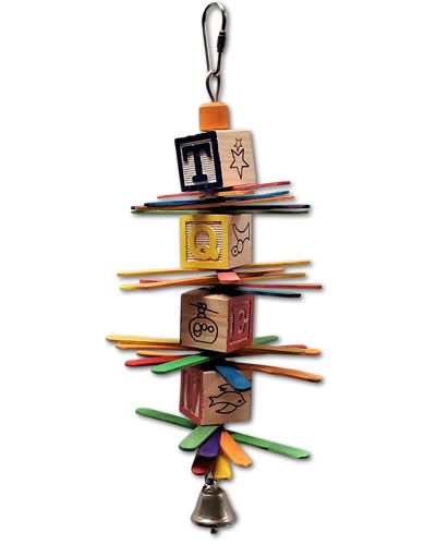 This toy consists of brightly colored ice sticks combined with wooden ABC blocks, wood beads and a bell. This toy is ideal for birds that love to chew.
