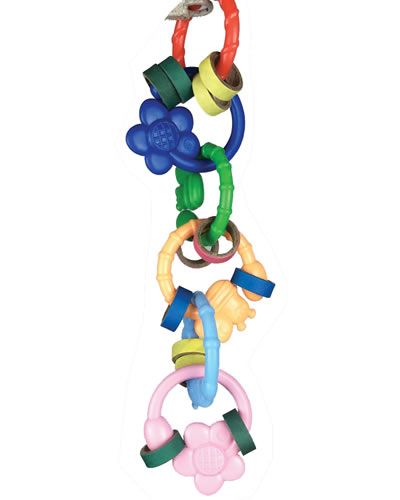 Happy Beaks Made in USA Floweringz bird toy features mini birdie bagel rings on plastic links.