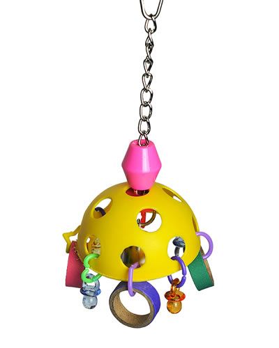 Dome delight bird toy has birdie bagels, acrylic pacifiers, and a bell inside all hung on durable chain.