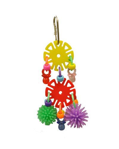 Happy beaks spikes & sun chips bird toy has two discs with beads, pacifiers and little koosh balls make this toy a new favorite that is sure to keep your bird busy!