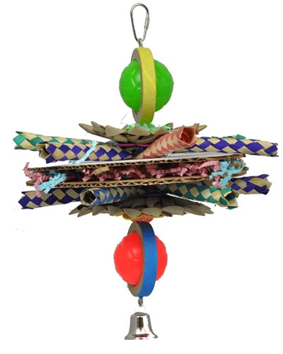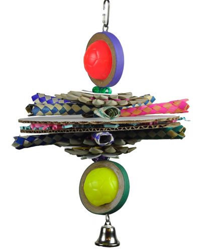 This toy consists of birdie bagels, plastic balls, bamboo finger traps, wooven palm stars and a bell. This toy is ideal for birds that love to chew. Stuff your bird's favorite treats in this toy to create foraging fun!