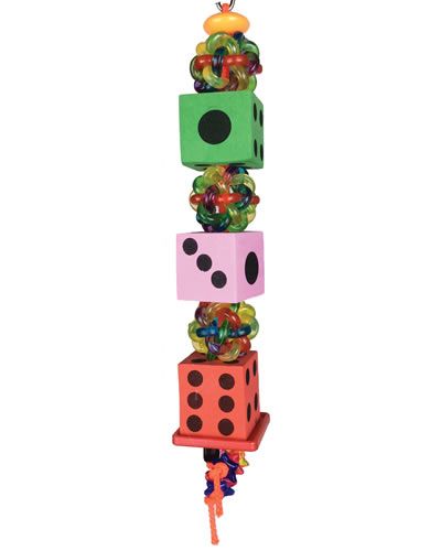 Happy Beaks Made In USA Tumbling Dice bird toy features a plastic bead, plastic shapes, wibbly balls and a foam dice staggered on poly rope. This toy can also be used to stuff your birds favorite treats in the wibbly balls.