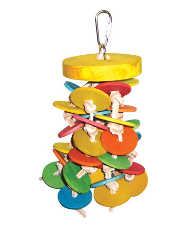 This bird toy is great for birds that love chewing wood and knots. Colorful wooden wafers are strung on knotted leather.