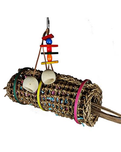 What an amazing toy! A super sized woven mat rolled up and secured with three birdie bagels. The inside is stuffed with lots of colorful shreddable paper and on either end. this toy is strung on a leather strip with plastic and colored wood pieces. Our owner said her birds can't get enough of this toy!!