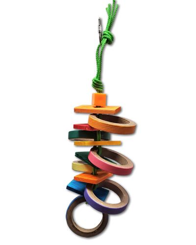 This toy is full of tons of colorful 2" Birdie Bagels and square wooden discs strung on poly rope. Birds love to chew and shred this toy.