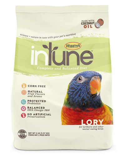 Higgins InTune® Complete and Balanced Diet for Lories and other nectar-eating birds is natural with added vitamins, minerals, and amino acids. inTune® is free of artificial preservatives, colorings and flavorings. inTune®’s antioxidant formula is made with nutritional coconut oil and contains balanced omega-3 & 6 as well as protected probiotics to support immunity. inTune® Lory is free of corn and made with real fruit and vegetable flavors like apples, blueberries and carrots. It can be served wet or dry