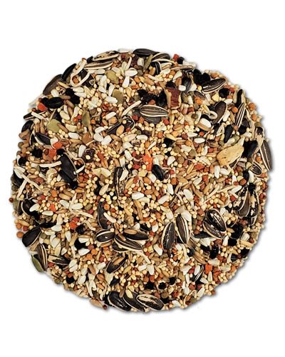 Ingredients: White Millet, Safflower, Wheat, Buckwheat, Canary Seed, Cracked Corn, Sunflower Chips, Oat Groats, Oil Sunflower, Canola, Red Millet, Cantaloupe Seed, German Millet, Flaxseed, Hemp Seed, Raisins, Cashew Pieces, Coconut Shreds, Walnut Pieces, Carrot Granules, Pepitas, Papaya Granules, Pineapple Granules, Almond Slices, Ground Corn, Brown Rice, Soybean Meal, Ground Wheat, Oat meal, Sucrose, Canola Oil (preserved with mixed Tocopherols, a source of Vitamin E), Dicalcium Phosphate, Dried Egg Product, Calcium Carbonate, Salt, Cranberry Pomace, Apple Fiber, Blueberry Fiber, Celery, Beets, Parsley, Lettuce, Watercress, Spinach, DL-Methionine, L-Lysine, Brewerâ??s Dried Yeast, Choline Chloride, Mixed Tocopherols (a natural preservative), Potassium Chloride, Yeast Extract, L-Ascorbyl-2-polyphosphate (Source of Vitamin C), L-Carnitine, Vitamin A Supplement, Vitamin D3 Supplement, Vitamin E Supplement, Zinc Sulfate, Ferrous Sulfate, Niacin, Folic Acid, Biotin, Manganese Sulfate, Copper Sulfate, Calcium Pantothenate, Thiamine Mononitrate, Pyridoxine Hydrochloride, Riboflavin, Zinc Proteinate, Manganese Proteinate, Copper Proteinate, Menadione Sodium Bisulfite Complex (Source of Vitamin K), Calcium Iodate, Sodium selenite, Cobalt Carbonate, Dried Bacillus subtilis Fermentation Product, Dried Bacillus coagulans fermentation product, Natural flavors, Rosemary Extract.