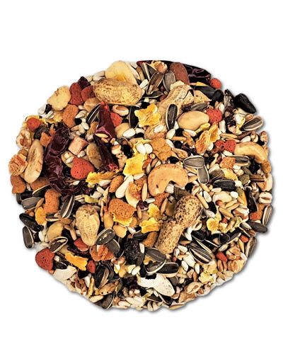 Ingredients: Safflower, Buckwheat, Sunflower Seed, Corn, Whole Oats, Wheat, Red Milo, Kafir Seed, Beet Dices, Pea Flakes, Hemp Seed, Peanuts in Shell, Pumpkin Seed, Roasted Soybean, Carrot Flakes, Maize Flakes, Raisins, Puffed Wheat, Shelled Almonds, Shelled Brazil, Shelled Filberts, Shelled Pecan, Banana Chips, Pistachios, Walnuts Pieces, Chili Peppers, Papaya Dices, Pineapple Dices, Ground Corn, Brown Rice, Soybean Meal, Ground Wheat, Oat meal, Sucrose, Canola Oil (preserved with mixed Tocopherols, a source of Vitamin E), Dicalcium Phosphate, Dried Egg Product, Calcium Carbonate, Salt, Cranberry Pomace, Apple Fiber, Blueberry Fiber, Celery, Beets, Parsley, Lettuce, Watercress, Spinach, DL-Methionine, L-Lysine, Brewerâ??s Dried Yeast, Choline Chloride, Mixed Tocopherols (a natural preservative), Potassium Chloride, Yeast Extract, L-Ascorbyl-2-polyphosphate (Source of Vitamin C), L-Carnitine, Vitamin A Supplement, Vitamin D3 Supplement, Vitamin E Supplement, Zinc Sulfate, Ferrous Sulfate, Niacin, Folic Acid, Biotin, Manganese Sulfate, Copper Sulfate, Calcium Pantothenate, Thiamine Mononitrate, Pyridoxine Hydrochloride, Riboflavin, Zinc Proteinate, Manganese Proteinate, Copper Proteinate, Menadione Sodium Bisulfite Complex (Source of Vitamin K), Calcium Iodate, Sodium selenite, Cobalt Carbonate, Dried Bacillus subtilis Fermentation Product, Dried Bacillus coagulans fermentation product, Natural flavors, Rosemary Extract.
