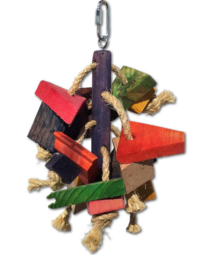 Jungle toys orangutan bird toy has colorful wood blocks all hung on sisal rope. Chewing will last for hours with this bird toy!