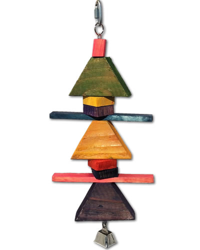 Jungle toys hippo bird toy has colorful wood blocks and a bell at the bottom all hung on chain.