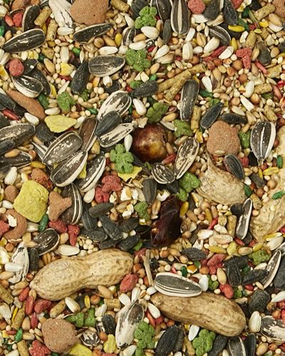 Ingredients: Canary Grass Seed, White Millet, Safflower Seed, Oat Groats, Ground Corn, Red Millet, Wheat, Toasted Corn Flakes, Buckwheat, Flax Seed, Corn Gluten Meal, Ground Wheat, Dehulled Soybean Meal, Ground Rice, Calcium Carbonate, Wheat Middlings, Dicalcium Phosphate, Salt, Soy Oil, Whole Cell Algae Meal (source of Omega-3 DHA), Sun-cured Alfalfa Meal, Brewers Dried Yeast, Wheat Germ Meal, L-Lysine, Fructooligosaccharide, Ground Flax Seed, Vitamin A Supplement, Choline Chloride, Spirulina, Yeast Extract, Riboflavin Supplement, DL-Methionine, Vitamin B12 Supplement, Vitamin E Supplement, Mixed Tocopherols (a preservative), Niacin, Ferrous Sulfate, Manganous Oxide, Zinc Oxide, Orange Oil, Menadione Sodium Bisulfite Complex (source of vitamin K activity), L-Carnitine, Rosemary Extract, Citric Acid, Cholecalciferol (source of vitamin D3), Copper Sulfate, Calcium Pantothenate, Pyridoxine Hydrochloride, Thiamine Mononitrate, Folic Acid, Calcium Iodate, Biotin, Dried Bacillus licheniformis Fermentati