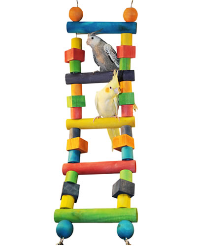 This colorful bird ladder made of different fun wooden shapes is all strung on heavy flexible wire that is durable and bird safe. Attaches easily with quick links on both ends.