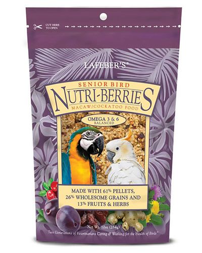 Lafeber's Senior Bird Nutri-Berries Macaw Food is generally for bird that have reached half of their expected life expectancy. Senior Bird Nutri-Berries offer the same balanced nutrition as classic and gourmet Nutri-Berries, plus it is formulated to meet the special needs of mature birds. This balanced and low calorie daily food promotes optimum health through the "golden years" of life. Senior Bird Nutri-Berries are packed with age targeting herbs such as milk thistle, dandelion, and ginger.