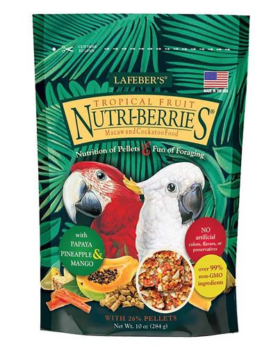 Lafebers Tropical Fruit Nutri-Berries Macaw are a nutritious combination of papaya, pineapple, mango, and other wholesome ingredients with a special shape to reduce waste. These compact balls of seeds, grains, and vitamins are easy for birds to pick up and eat and are a favorite among the beaks.