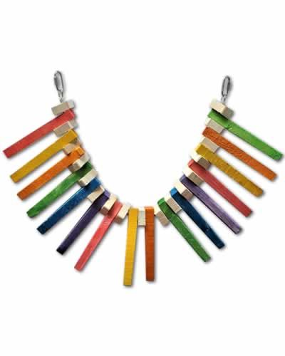 Jungle toys Super Tiger Tail bird toy features colorful wood triangles hung on a durable chain. This versatile toy can easily be hung on the side of your bird's cage or using both hooks can be hung from the top.