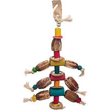 This toy overflows with play options to keep birds busy with swinging, shredding, chewing, foraging, climbing activities and more! It features brightly colored bamboo, coconut husks, sisal and more! This bird toy is all-natural, hand-made, earth friendly and pesticide free and will help prevent feather picking by breaking your bird's boredom.