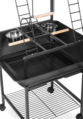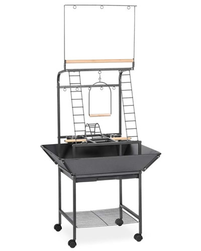 Prevue Pet Products Small Parrot Playstand Black Hammertone 3181 includes 8 hooks for hanging multiple toys and treats, along with 3 ladders for plenty of space to climb. A swing is even included for more playing fun! Double cups provide room for food, water and treats, and the easy-rolling caster stand lets you easily move the playstand from room to room or indoors to outdoors. A pullout tray, along with the rounded corner seed guard, make cleaning quick and easy, while the bottom storage shelf is perfect for keeping extra food, treats, toys and cleaning supplies. Our Small Parrot Playstand is available in a non-toxic, powder-coated, black hammertone finish.