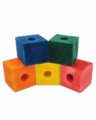 1" Wood block bird toy part. Assorted colors. Dimensions: 1" Length x 1" Width x 1" Height (3/8" Hole)
