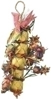 A tower of fun for your bird and so much to keep him or her occupied. This toy is a tower of woven balls, layered with additional woven shapes; coming out from either side are lots of additional chewing strands, each about 4" long. These strands have it all - woven balls, stars and natural fibers poking out all over.