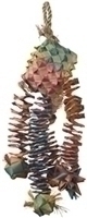 Bouncing, chewing, shredding, and swinging fun! A super stuffed natural woven square at the top overflows with long woven strands that are topped off with a woven star and additional smaller woven squares.