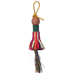 This all natural material toy is perfect for the smaller birds; made of palm leaf and other natural fibers. Two food grade colored small balls can be found at the top and hidden in the "skirt" of this toy perfect for beaking, preening and shredding.