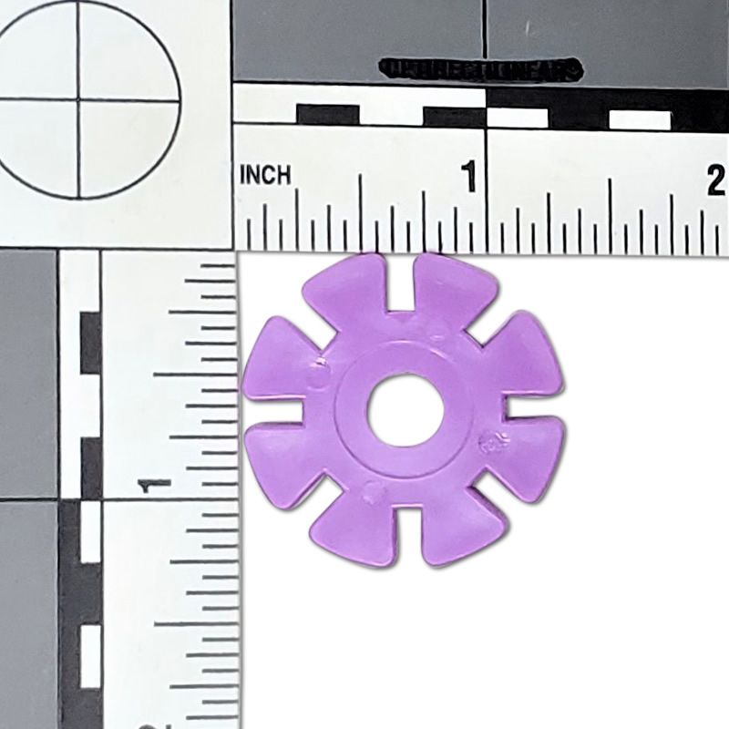 1-1/4" Plastic snowflake bird toy part. Dimensions: 1-1/4" Diameter x 1/8" height with a 5/16" hole. Assorted colors.