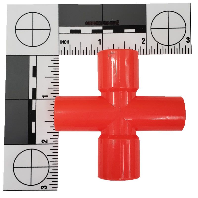 Plastic four way connector bird toy part. Assorted Colors. 5/8" inner male diameter and 3/4" inner female diameter.