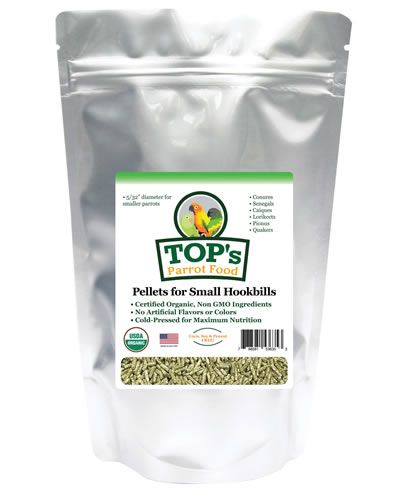 TOP’s Small Pellets™ 10lb bag is USDA Organic Certified and perfect for mid-size and smaller parrots, like conures, quakers, and parrots who eat directly out of the bowl.