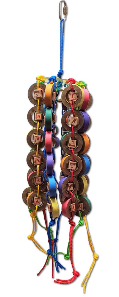 Does your bird love birdie bagels? Then, this toy is sure to be a favorite. It is made colored wood beads, Poly Rope, Birdie Bagels and a bell nestled in the center. The different textures will occupy and keep your bird chewing for hours.