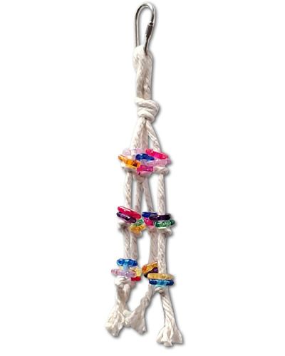 Bird toy creations cotton chew bird toy has transparent plastic beads strung on bird safe rope.