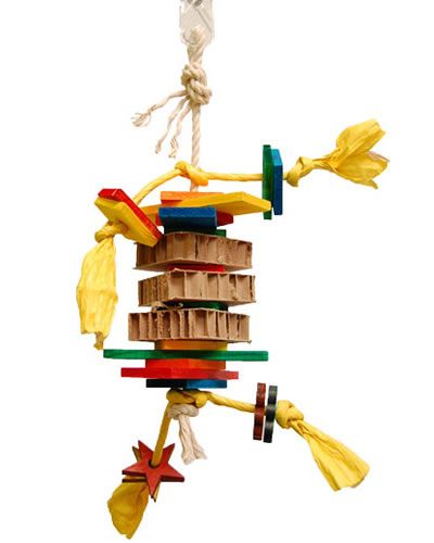 Zoo-Max Dynamite small bird toy has colored pieces of wood, various colored wood shapes, cardboard slice that is all hung on cotton rope and paper twist rope . Cardboard slices can be used to hide your bird's favorite foraging treats.