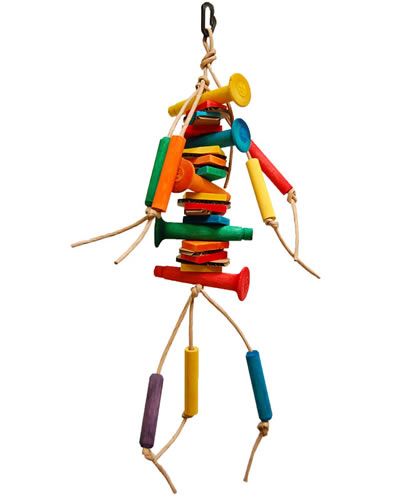 Zoo-Max Dynamite x-small bird toy has colored pieces of wood, various colored wood shapes, cardboard slice that is all hung paper twist rope . Cardboard slices can be used to hide your bird's favorite foraging treats.
