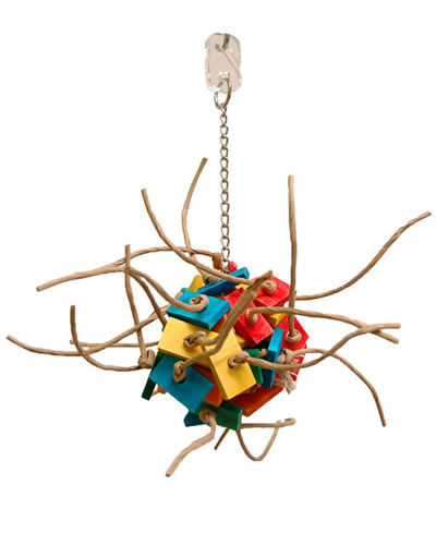 The new Fireball is a great toy for your bird. Many wood pieces to have fun with. You can hide a treat inside the paper rope. Mounted on a chain this is a tough toy. Made of 20 feet of paper rope and 48 wood pieces