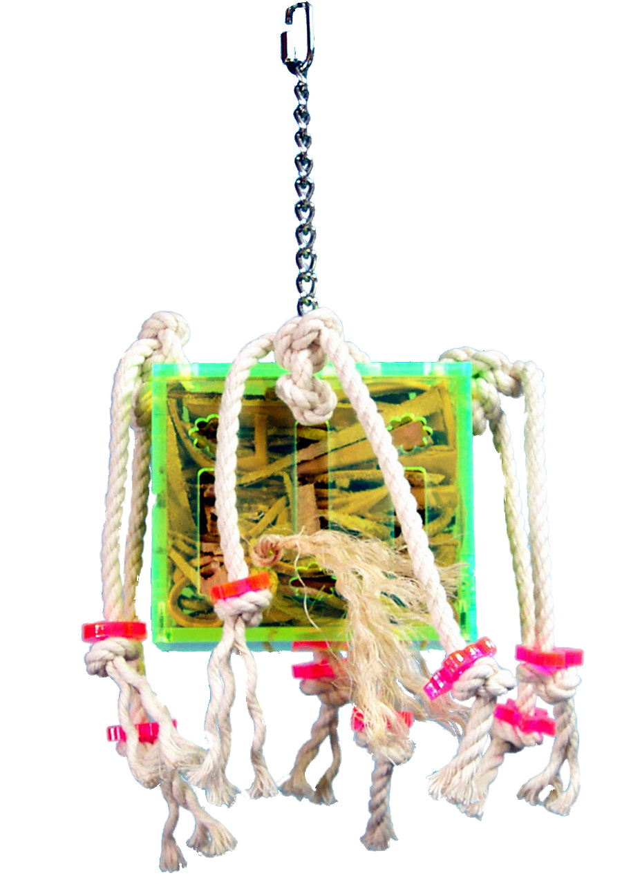 A terrific foraging toy! A bunch of leather strips are stuffed inside of an acrylic box that has openings on all sides of it. The top lid opens to refill the toy with either more leather or other foraging goodies!