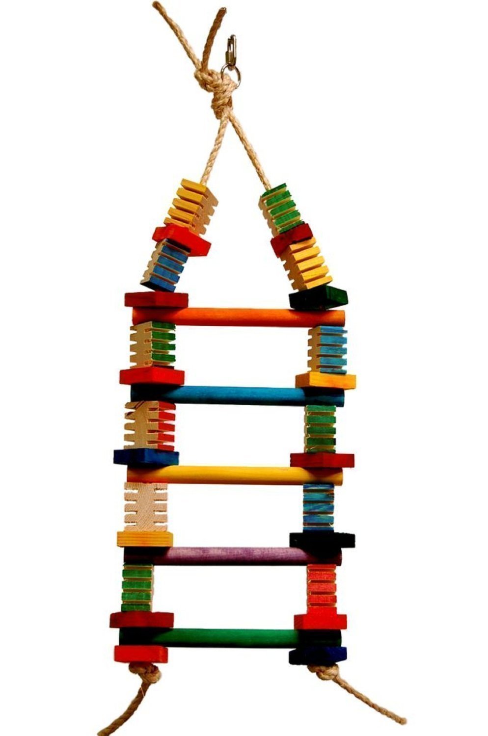 A 5 rung bird ladder that can't be resisted due to the bright colors, and the tantalizing multicolor wooden blocks in a variety of shapes. The rotating wooden blocks are designed to encourage chewing. Entire wooden bird ladder is held together by sisal rope.
