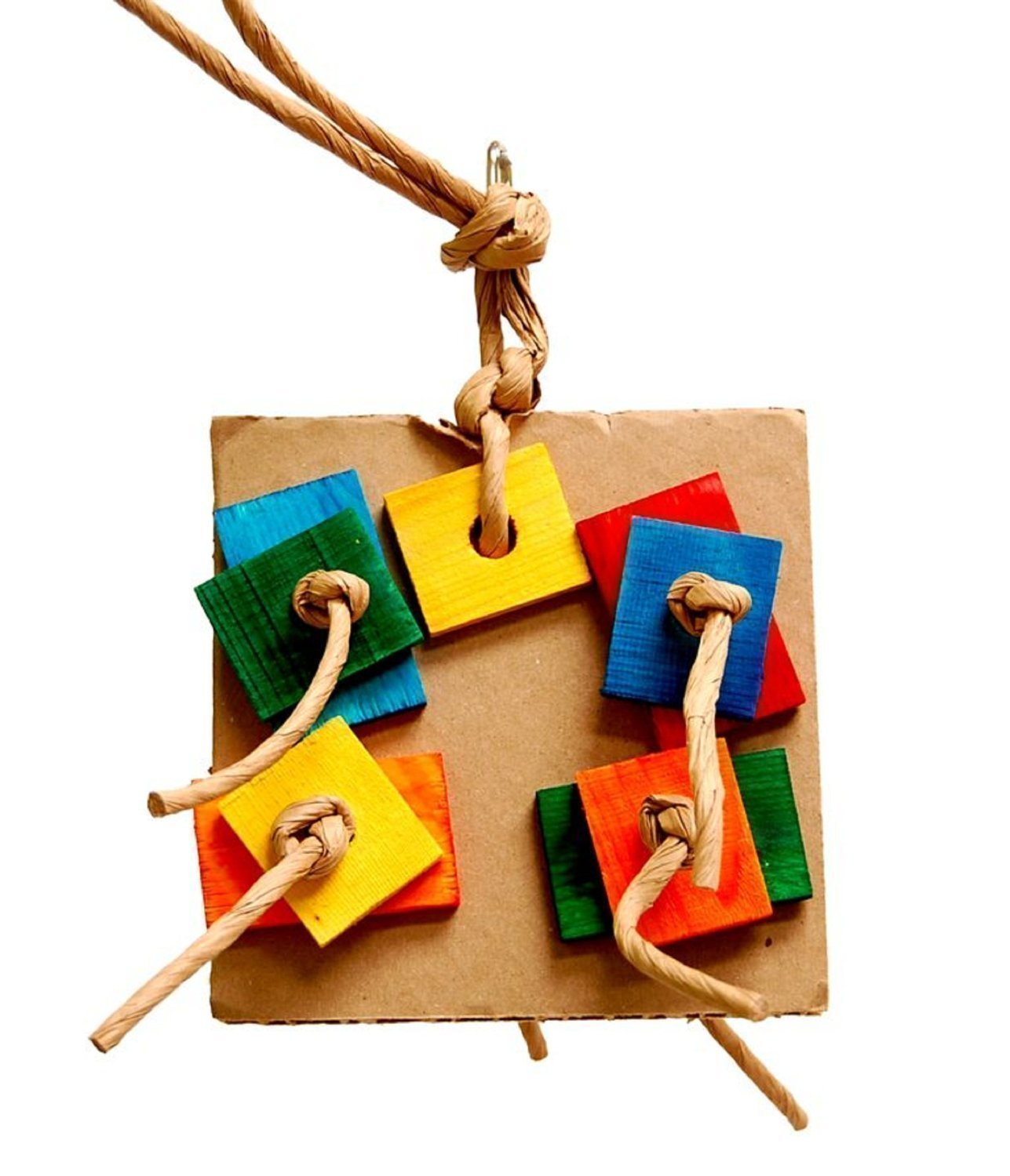 Designed to stimulate your bird by using a large variety of shapes, colors and textures. This toy is compose of cardboard, wooden blocks and tightly twisted paper string and will keep your bird busy for hours.